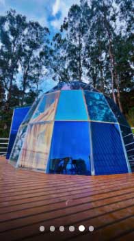 Transparent bubble-style dome for immersive stargazing. Includes blackout curtains, hot water, and private controls for heating.